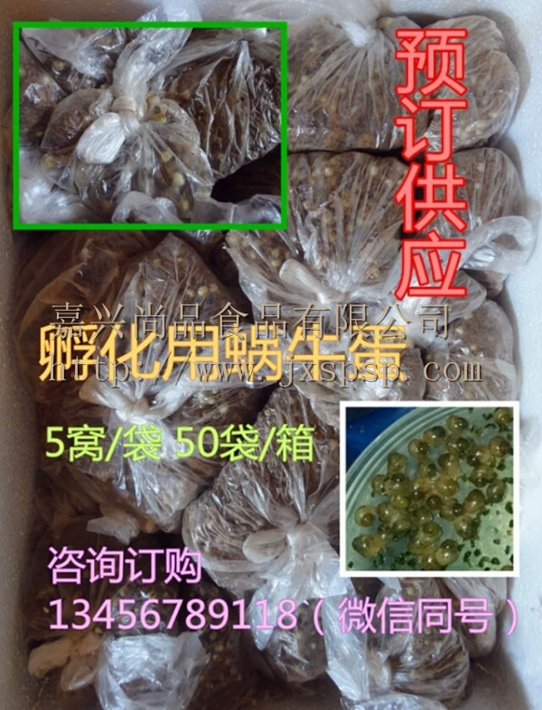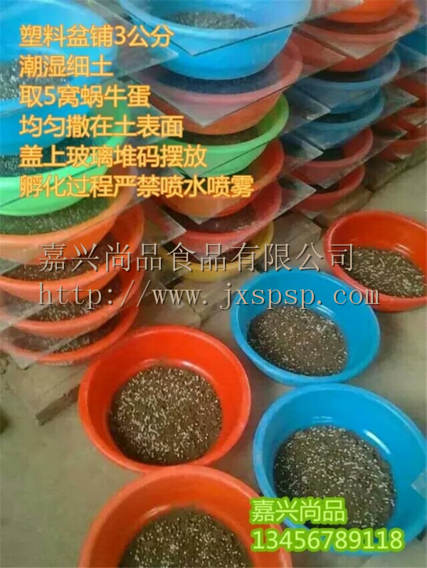 嘉兴尚品食品有限公司经过两年来的不断摸索,现面向白玉蜗牛养殖户推荐购买蜗牛蛋(蜗牛卵)进行孵化养殖白玉蜗牛,具有如下优势:1、孵化用蜗牛蛋健康无病菌;2、缩短养殖周期;3、提高养殖成功率;4、每月每季度可以灵活进蛋进行养殖,做到批量养殖和出售; 2017年预测蜗牛价格行情看好,需要养殖的朋友请联系本公司进行种蛋的预订,免费提供养殖技术指导,同时收购商品蜗牛及蜗牛冻肉,欢迎养殖户签定供销合同,加盟本公司蜗牛养殖,联系电话13456789118(微信同号)。